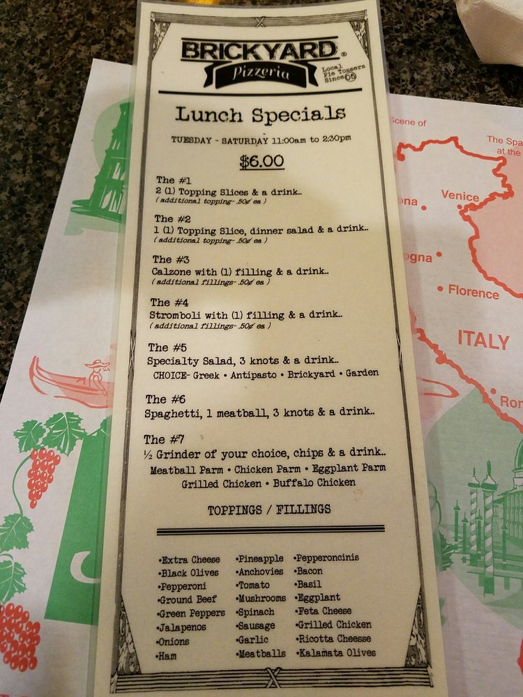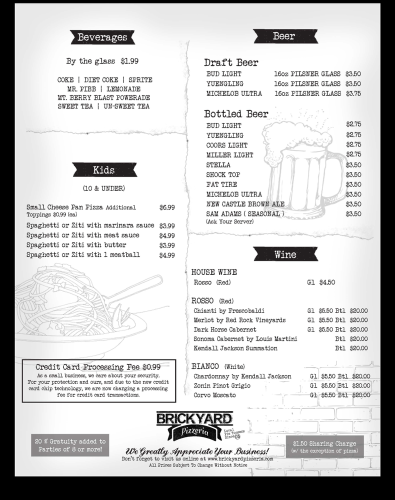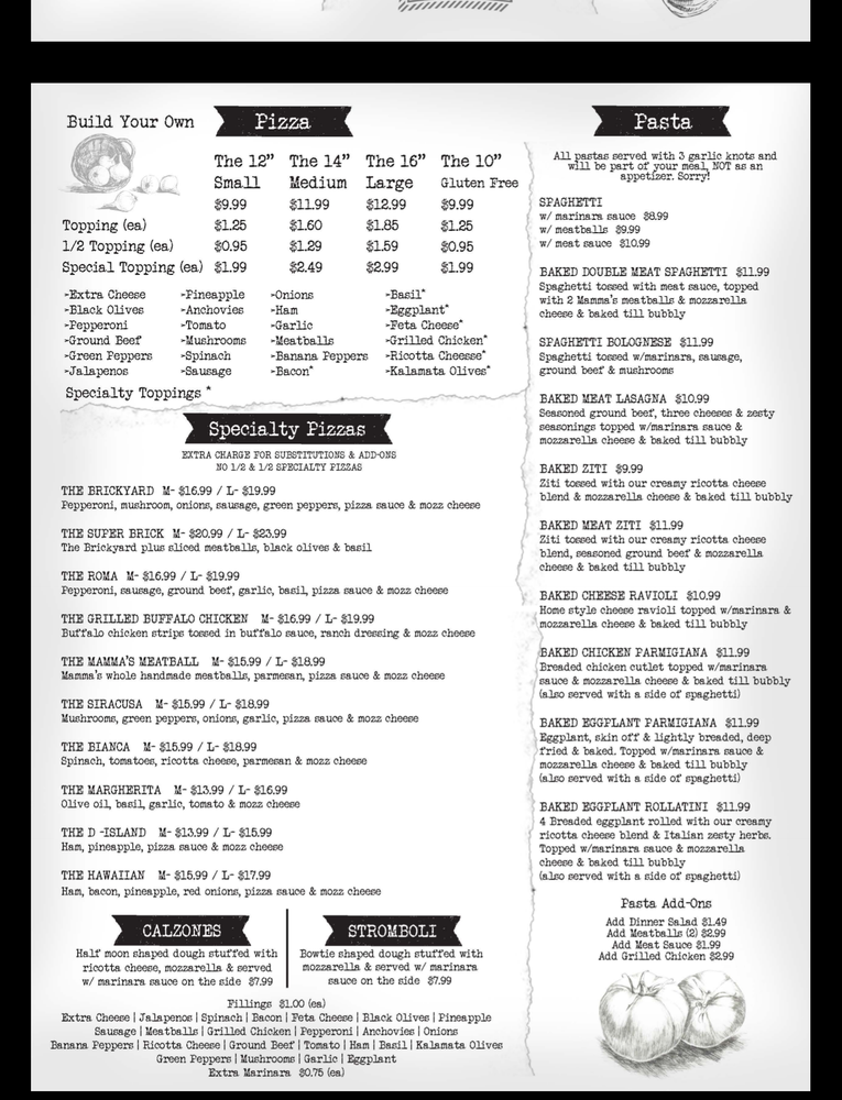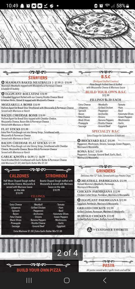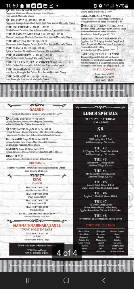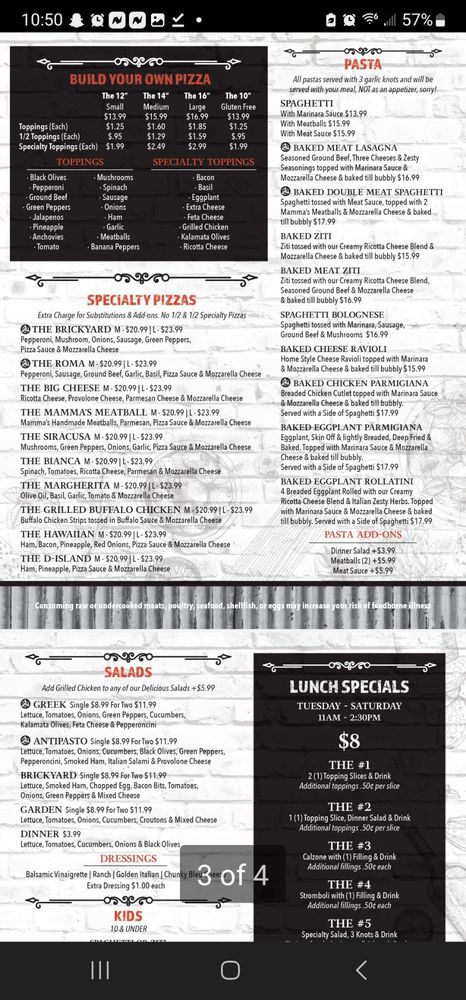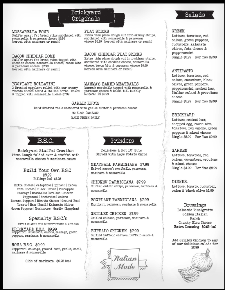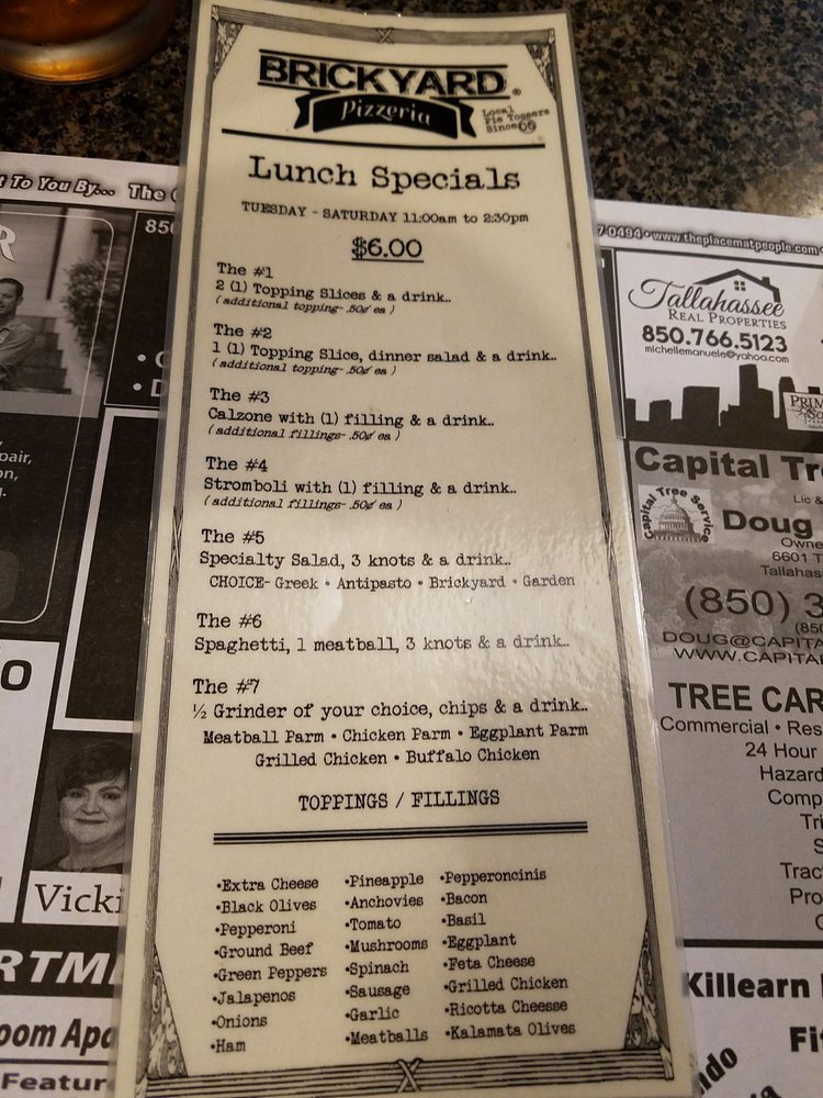 Brickyard Pizzeria, located in Tallahassee, FL, is a casual Italian pizza spot offering delivery, takeout, and outdoor seating. Their menu features a variety of delicious starters like Fatsos Cheesy Bread and Mammas Baked Meatballs. Their salads, including the Greek and Antipasto, are packed with fresh ingredients and flavor. But the star of the show is their pizza, with options for customizable toppings and specialty choices like Spec Toppings. The ambiance is perfect for families and groups, with options for both lunch and dinner. Whether you're craving a classic Margherita pizza or something more unique, Brickyard Pizzeria has something for everyone. Don't forget to try their Garlic Knots - a must-try treat!